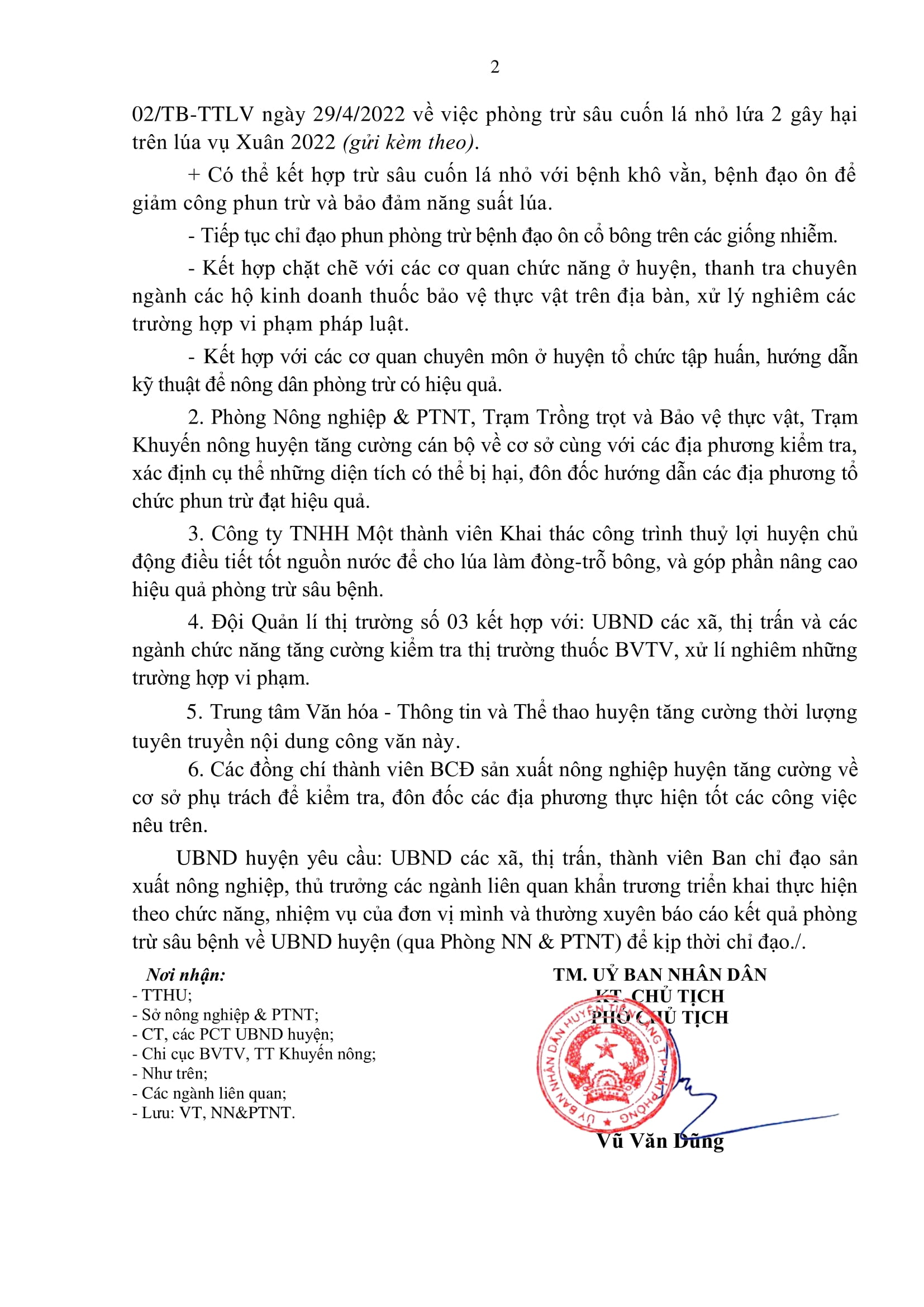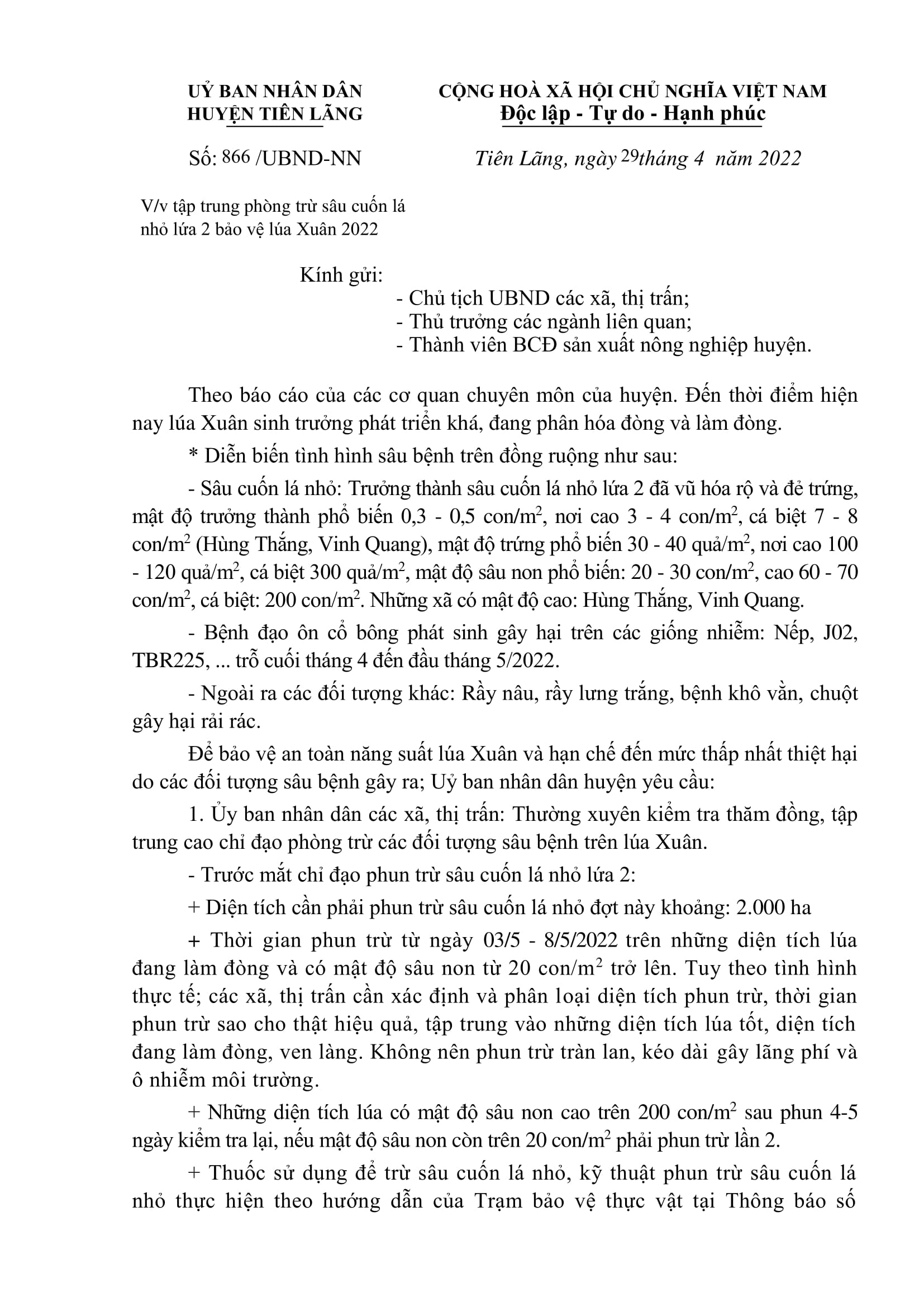 Ủy ban nhân dân huyện Tiên Lãng Ban hành công văn về việc tập trung phòng trừ sâu cuốn lá nhỏ lứa 2 bảo vệ lúa Xuân 2022