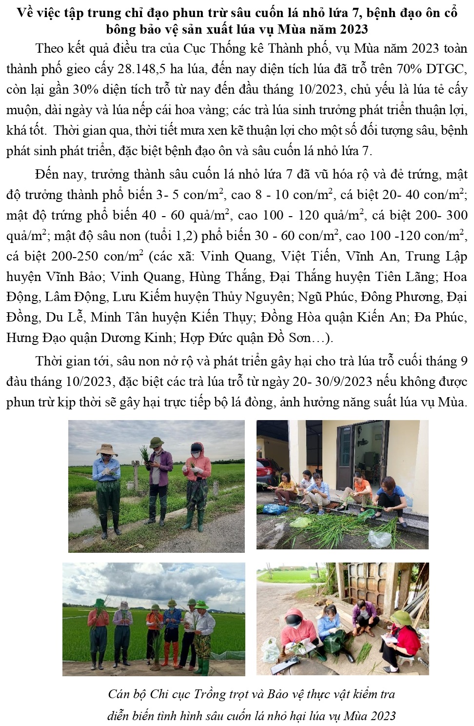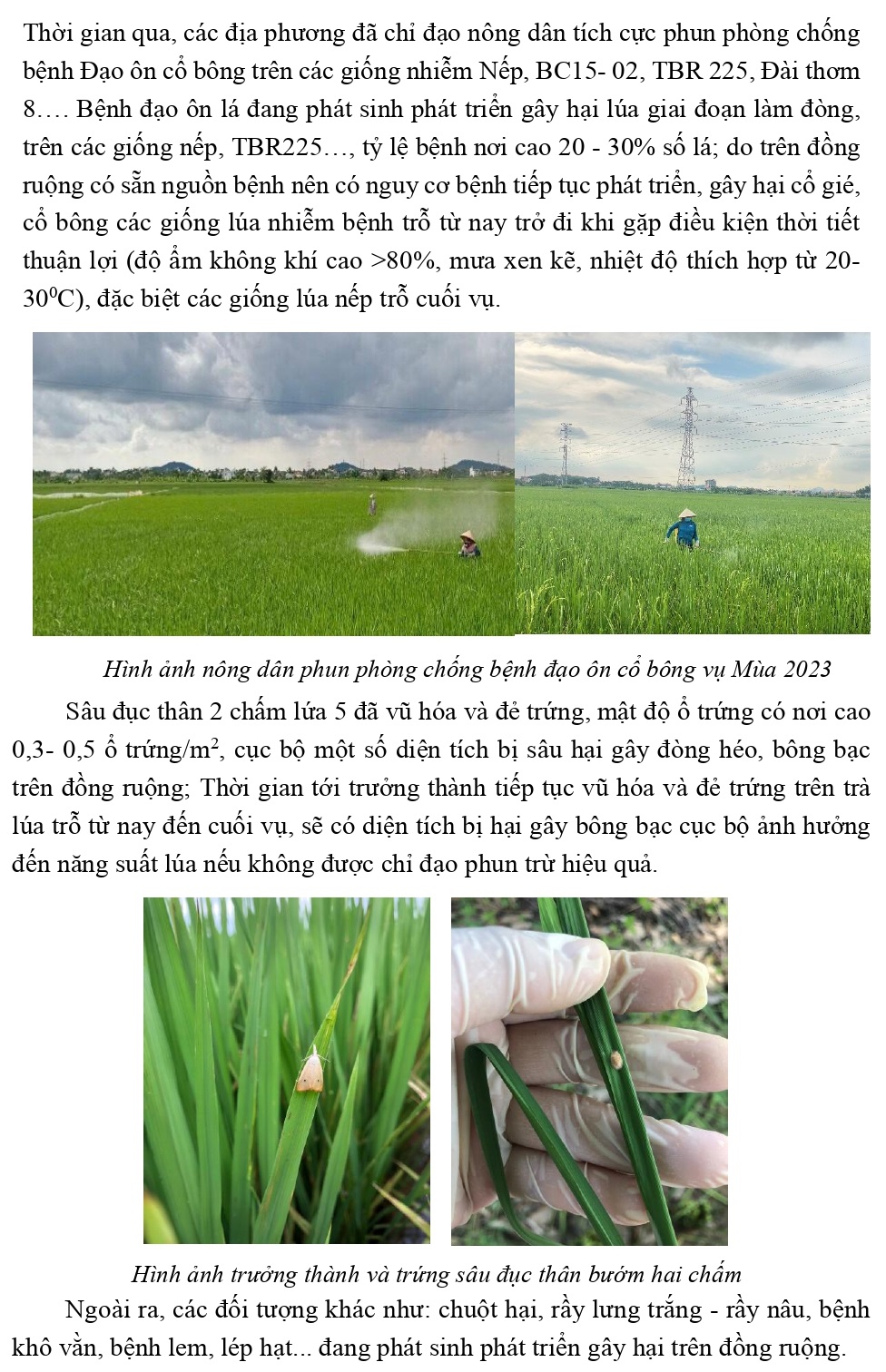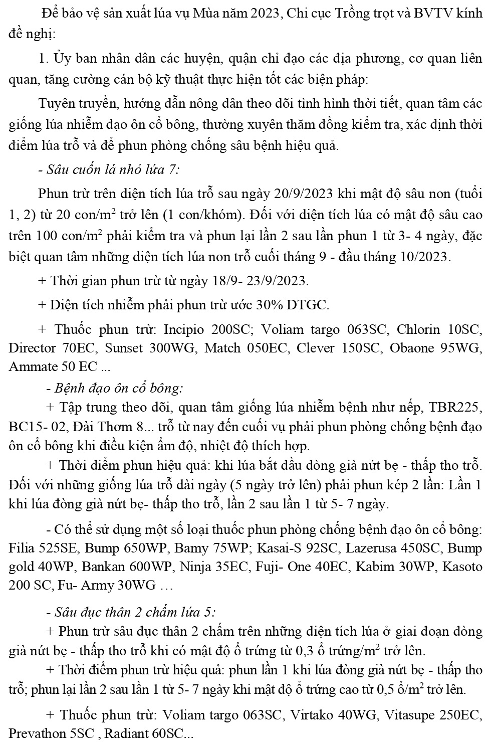 Công văn Về việc tập trung chỉ đạo phun trừ sâu cuốn lá nhỏ lứa 7, bệnh đạo ôn cổ bông bảo vệ sản xuất lúa vụ Mùa năm 2023