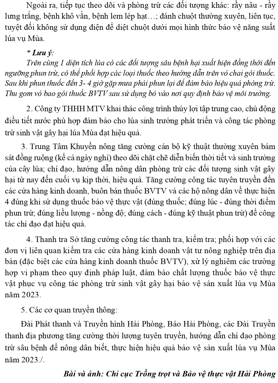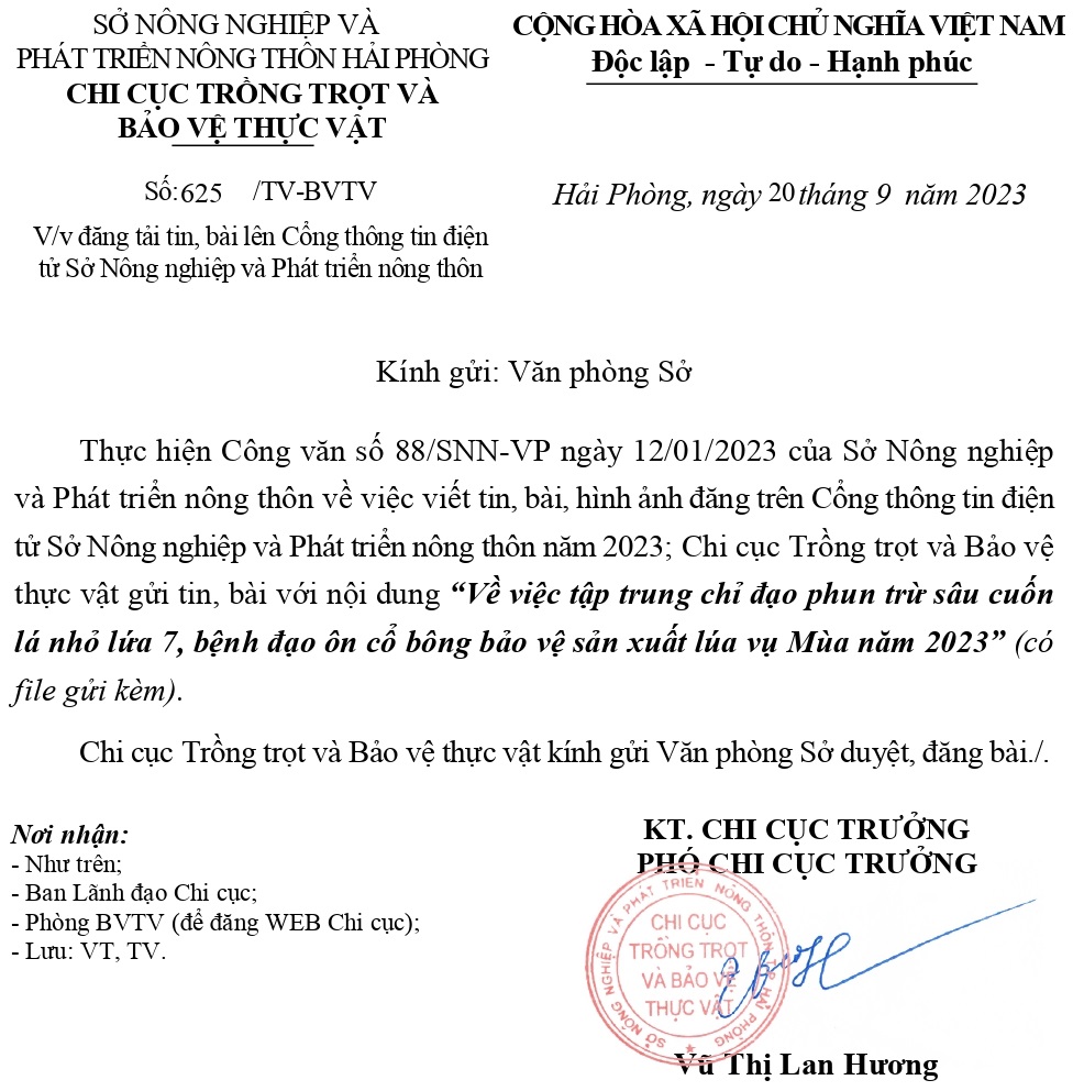 Chi cục Trồng trọt và Bảo vệ thực vật đăng tải tin, bài lên Cổng thông tin điện tử Sở Nông nghiệp và Phát triển nông thôn Về Tập trung chỉ đạo phun trừ Sâu cuốn lá nhỏ lứa 6 bảo vệ sản xuất lúa vụ Mùa năm 2023
